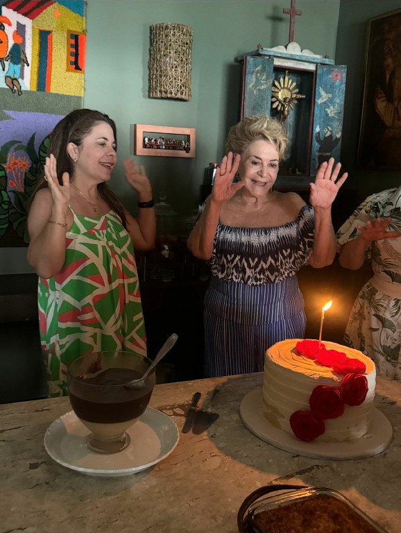 Maria da Graça Ferreira de Souza Viveiros recebe com elegância e naturalidade e ganhou o carinho das amigas neste finalzinho de verão, quando festejamos seu aniversário recente. Hummmmm… o bolo de Tereza Vale estava divino, dividindo a mesa com um duo de chocolate preto e branco e o bom-bocado tradicional da casa.