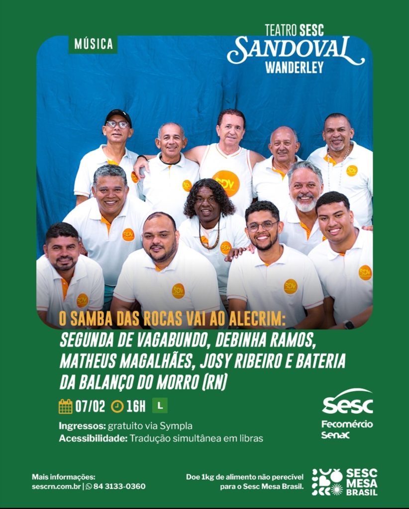 É samba, é raiz, é encontro de gerações! No dia 07 de fevereiro, às 16h, o Teatro Sesc Sandoval Wanderley recebe um grande encontro do samba potiguar com Segunda de Vagabundo, Debinha Ramos, Matheus Magalhães, Josy Ribeiro e Bateria da Balanço do Morro.