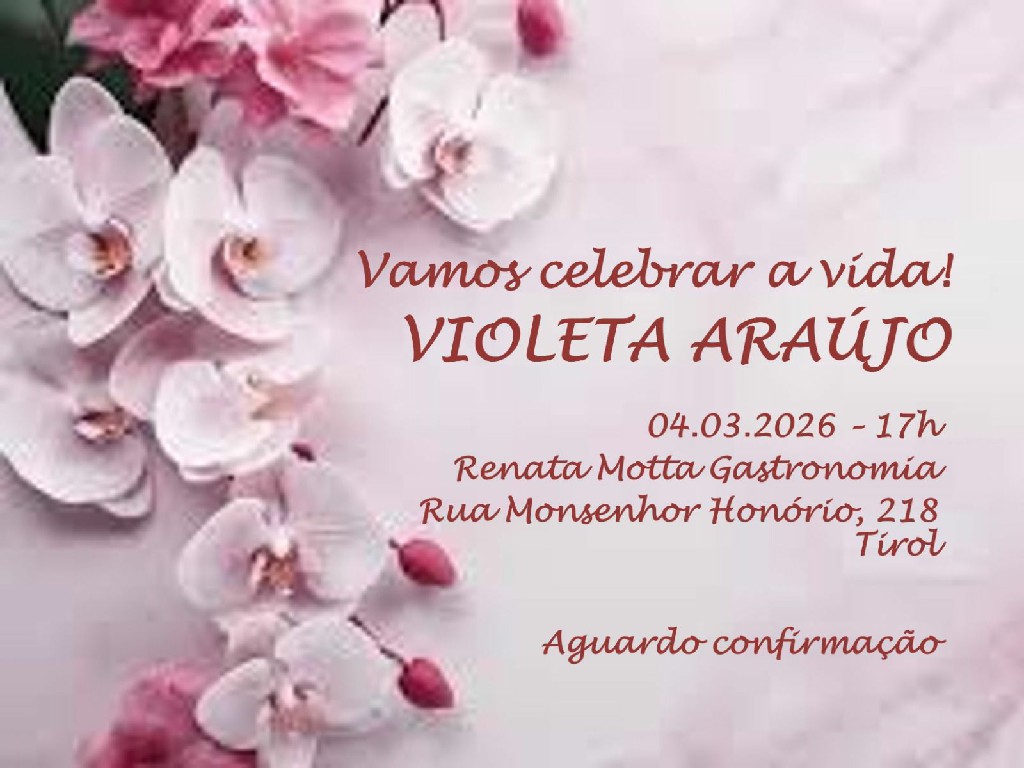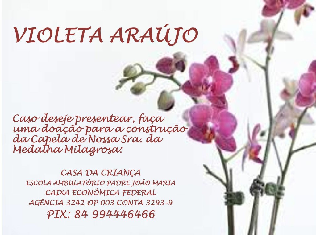 Nossa querida Violeta Fagundes Araújo é um exemplo na nossa sociedade. Exemplo de correção com as amizades, cuidadosa com a família, sempre grata e com vida ativa no seu círculo de amizades… Violeta é exemplo com disposição para atender convites e ser sempre grata nos seus “noventa e poucos anos”.