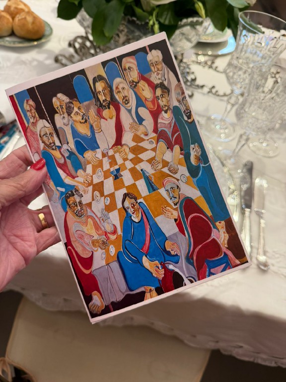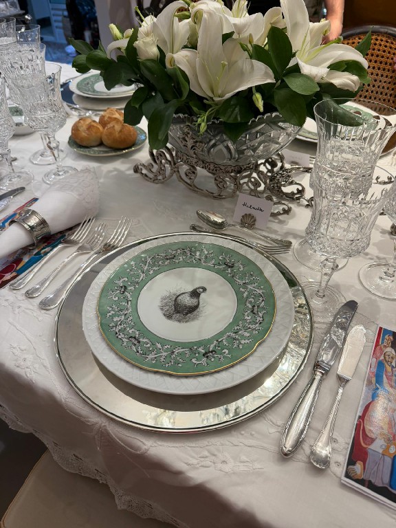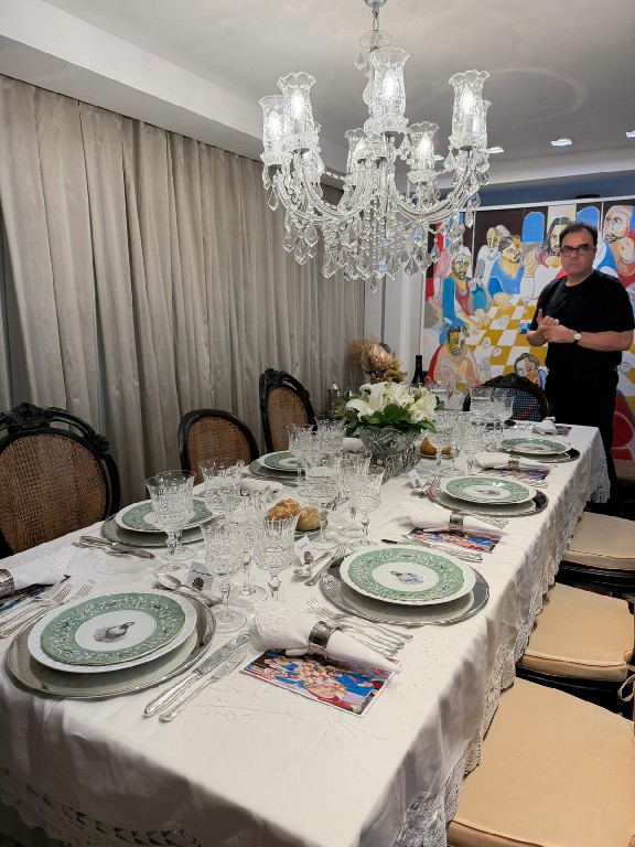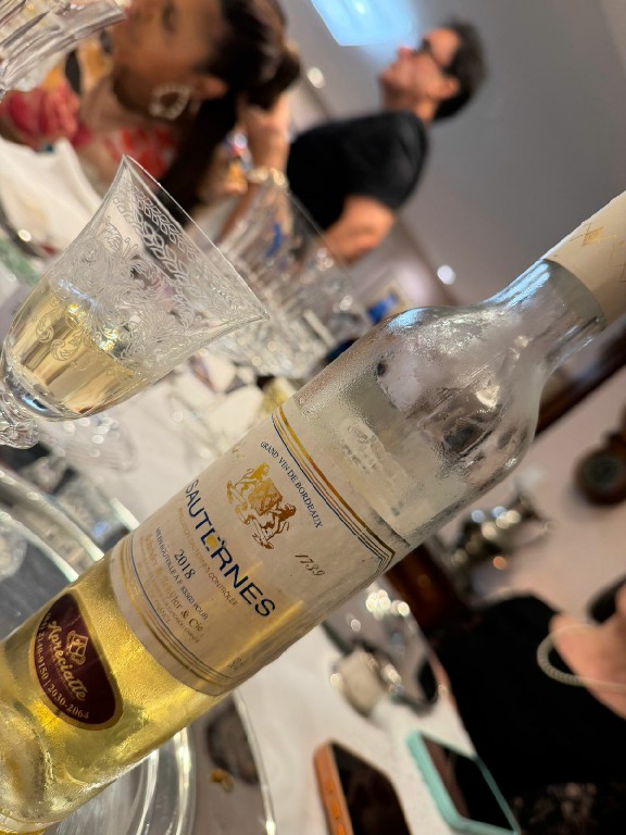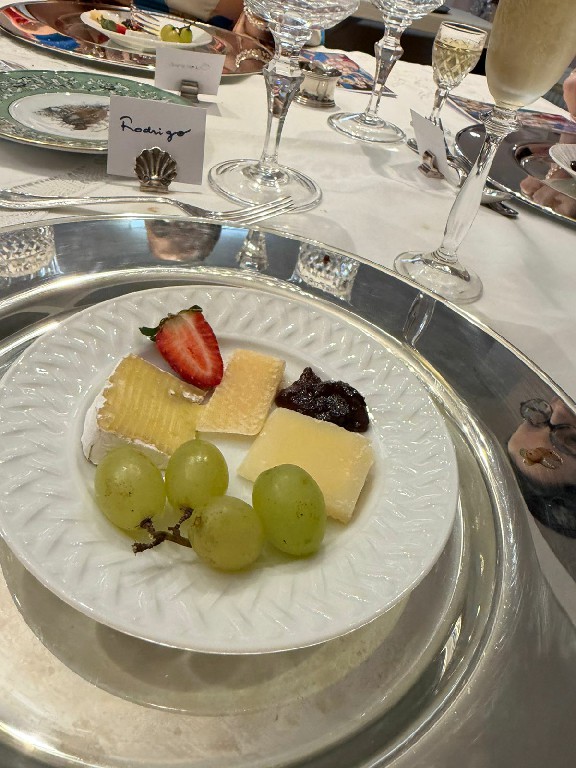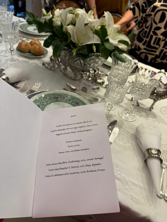 No jantar, um cardápio com cocotte com moqueca de camarão e flor de sal, lagostas braseadas com manteiga composta, ervas e cítricos, e mignon a la sauce boeuf e risoto parmigiano. O jantar seguiu elegante, com vinho branco e tinto; encerrando com as sobremesas: pudim de pistache, pudim de leite (zero lactose chic) e panna cotta com frutas vermelhas acompanhadas de um salternes 2018… No final, um cafezinho expresso e uma seleção de licores.