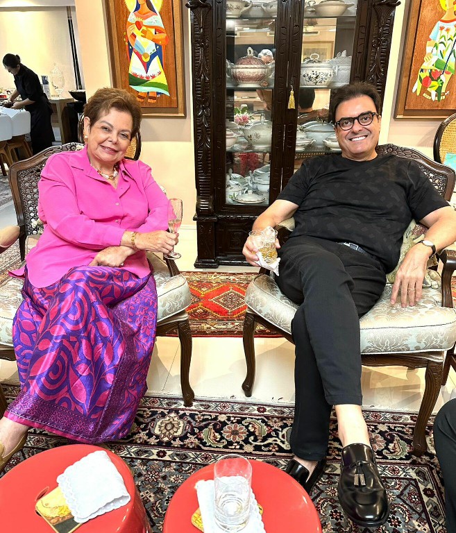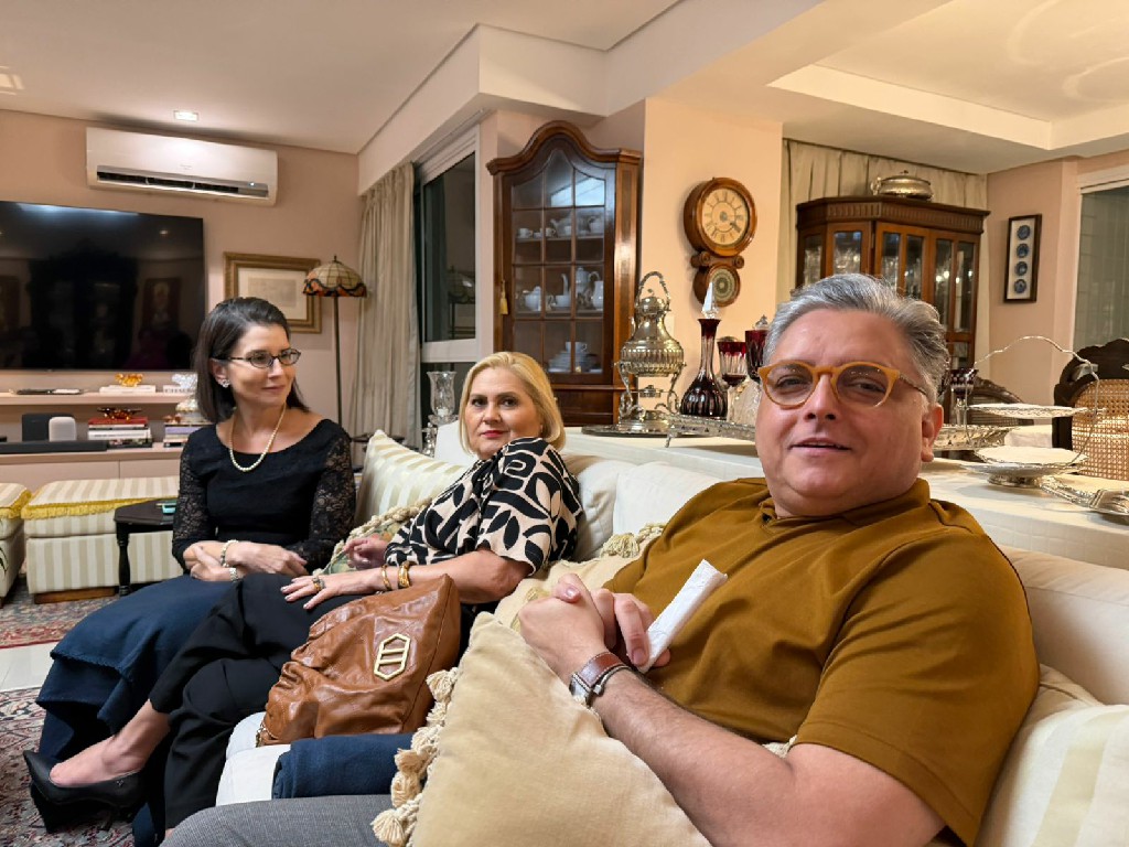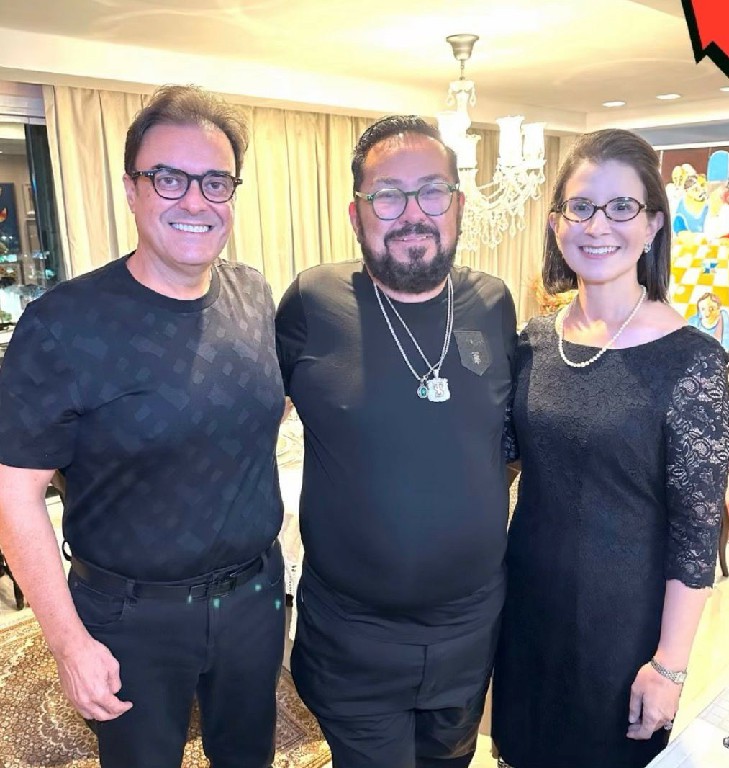 Os anfitriões Édson e Adriana, elegantes em negro, a hostess chic com pérolas.