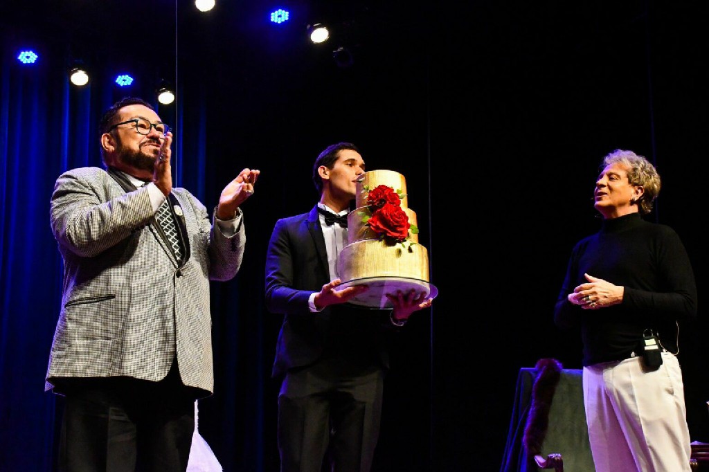 Ao final do espetáculo, um bolo red vibrante no centro do palco fez a plateia aplaudir e cantar parabéns pelos 7.5 do nosso fofo.