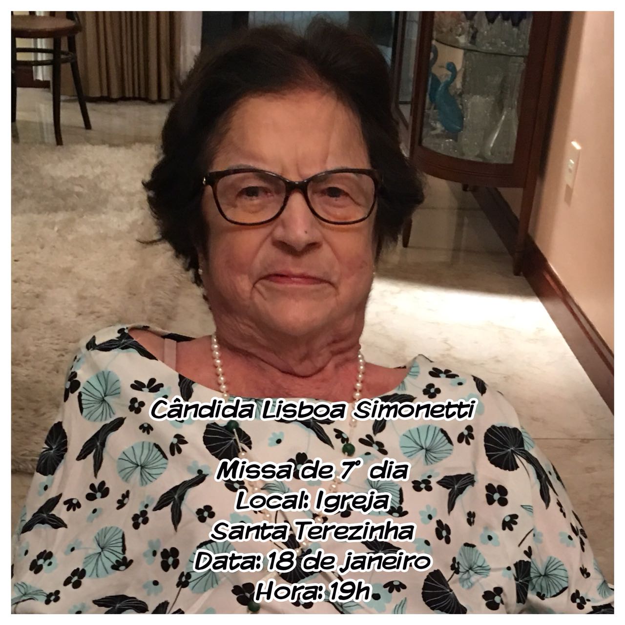 Na próxima quinta-feira (18), ocorre a missa de 7º Dia da partida da querida Cândida Lisboa Simonetti.